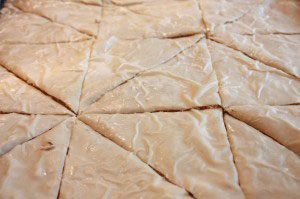 - Oštrim nožem izrežite baklavu na željene oblike , trokute, kocke ili čak romboide.