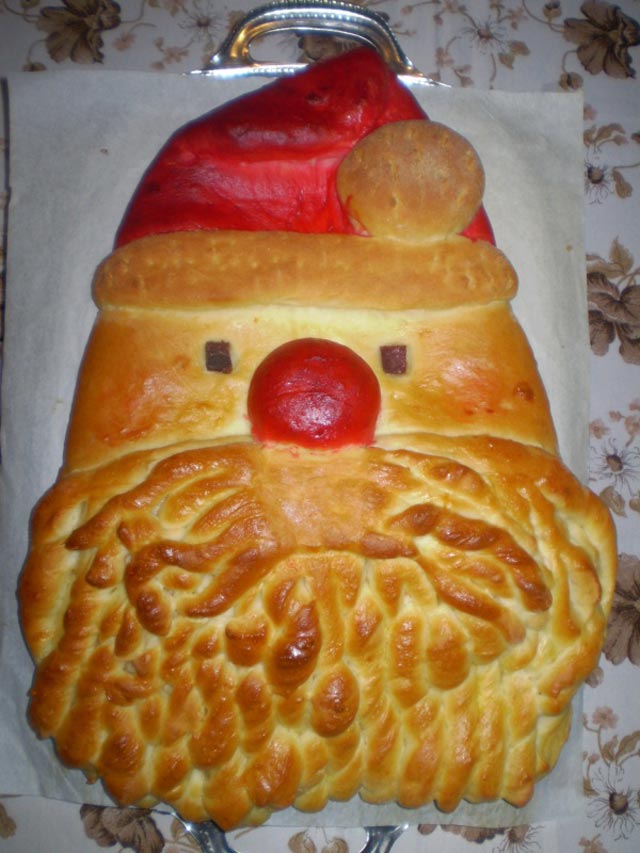 - Celog deda mraza premazati umucenim jajetom a kapicu i nos premazite jajetom koji izmesajte sa prehrambenom crvenom bojom.