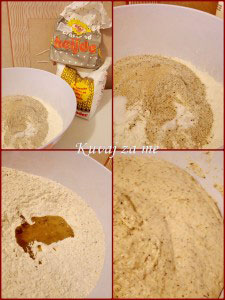 - Brašno lijepo izmiješati, te u njega dodati kašičicu soli i šećera, kesicu kvasca i tri kašike maslinovog ulja.