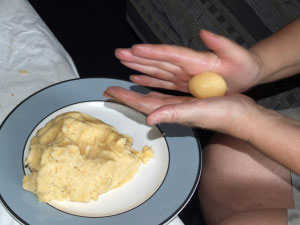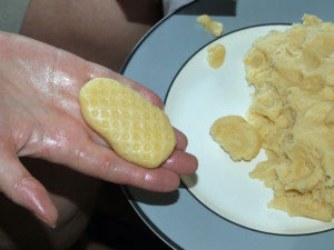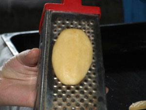 - Od testa pravite loptice veličine jajeta, pritisnite ih na rende da se dobiju šare (pogledajte sliku).