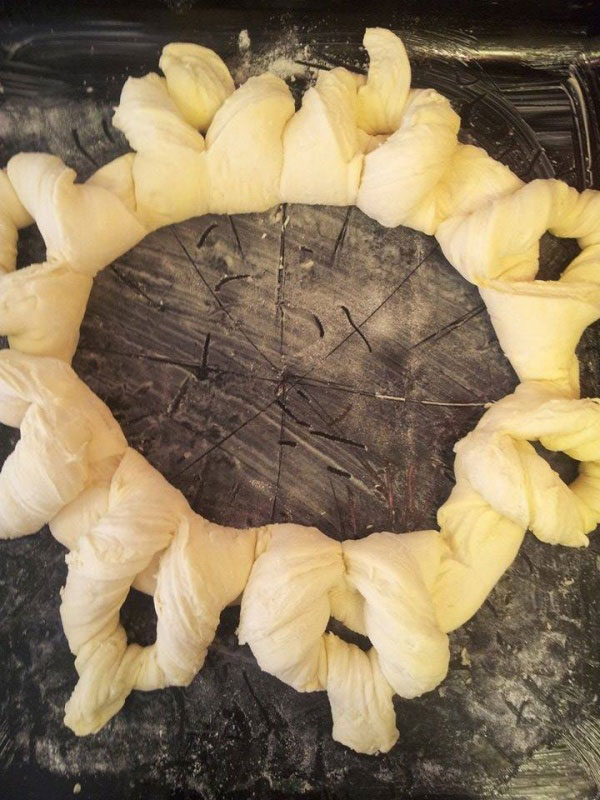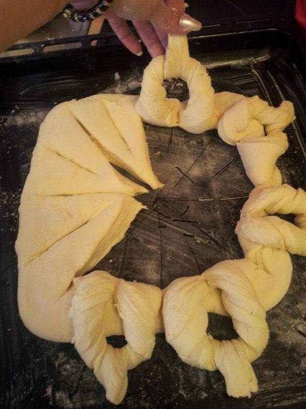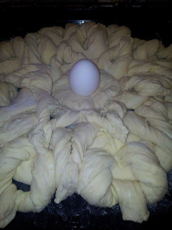 - U završni deo staviti malu lopticu od testa i u nju staviti 1 jaje. Ostaviti da nadođe, premazati 1 umućenim jajetom I posuti susamom.