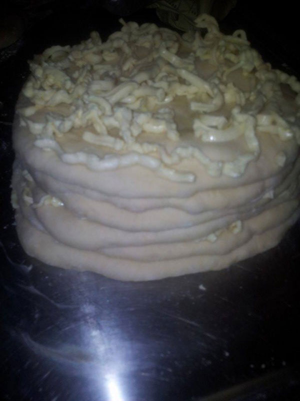 - Svaku lopticu razviti u srednji krug i izrendati margarin i tako 4 kore.