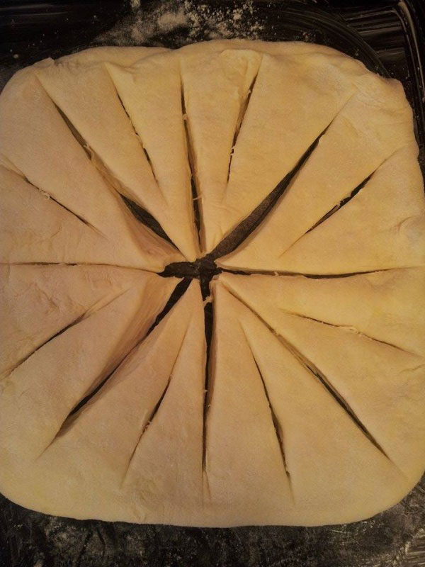 - Sve četiri kore razvuči oklagijom u željenoj veličcini kruga zatim staviti u podmazan pleh i iseći-videti na slici.