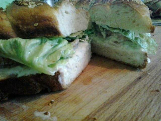 - Poklopiti gornjim dijelom peciva, presjeći po pola i služiti.
