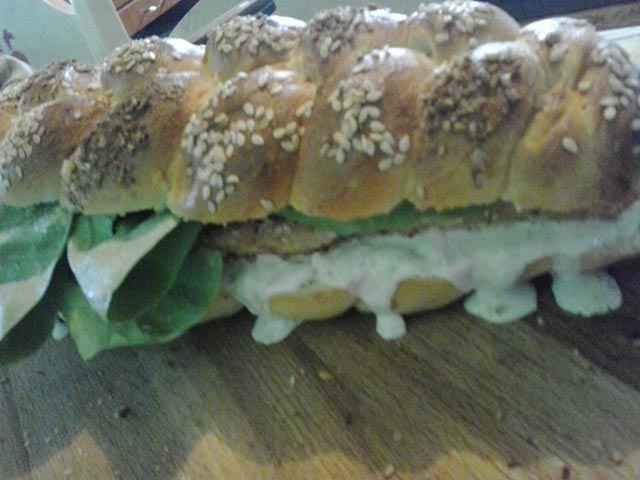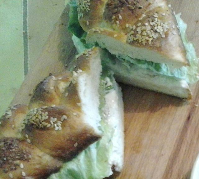 Osnova ovog sendviča je pecivo koje je u stvari francuski hljeb ili možete (kao što sam ja), sami napraviti mliječni hljeb u obliku koji želite. Ja sam odabrala oblik pletenice. Uz njega još samo možete poslužiti neku od sezonskih salata i čašu dobrog crvenog vina. S obzirom da je sendvič (slučajno ili namjerno) dovoljan za dvije osobe, presjecite ga po pola i podijelite sa vama dragom osobom. Prijatno!