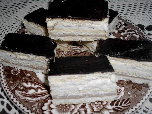 - Od mleka, šećera i brašna skuvajte krem, malo ga prohladite pa u njega dodajte prethodno umućen margarin. Krem podelite na dva dela pa u jedan dodajte kakao a u drugi rum.