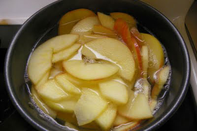 - U lonac dodajte 4 šolje vode, sok od limuna i 3 kašike bijelog šećera. Pustite da proključa i dodajte već isječene jabuke.